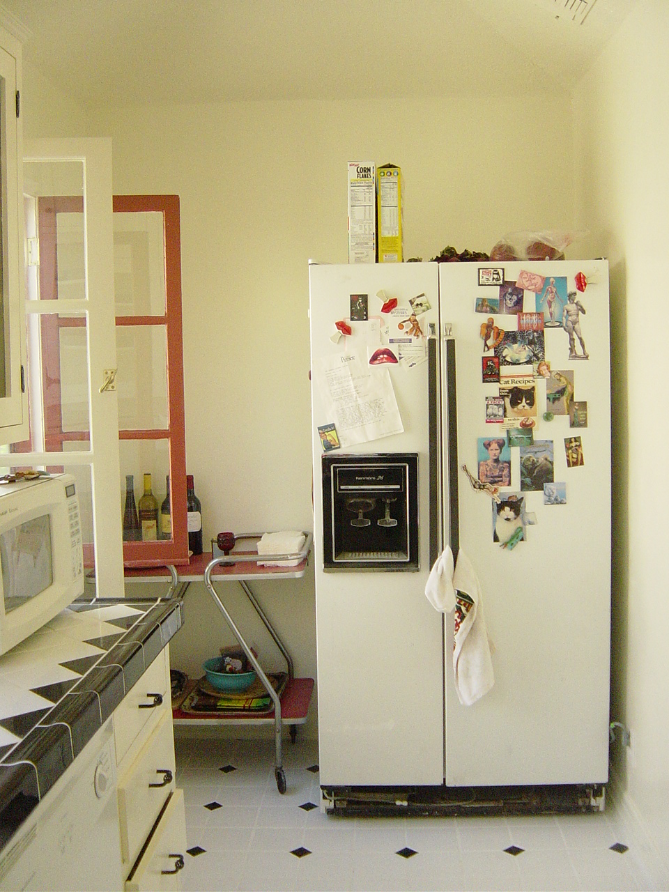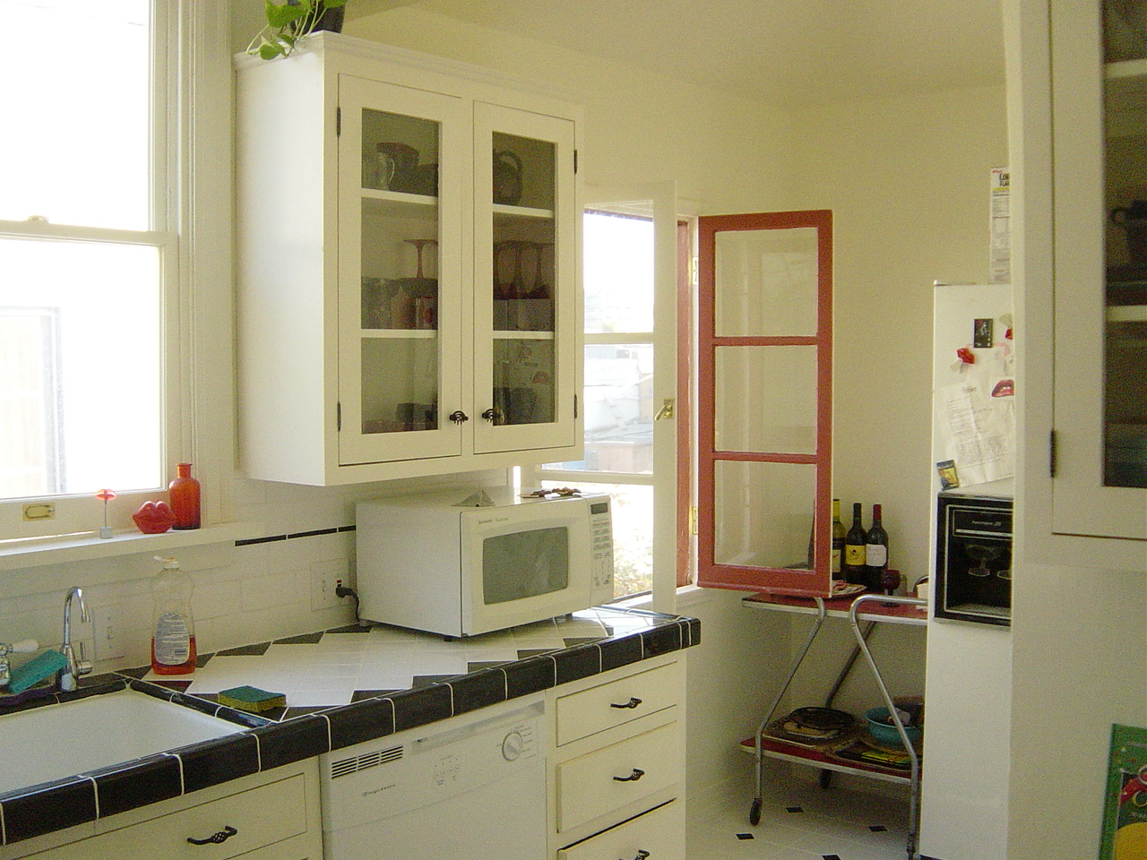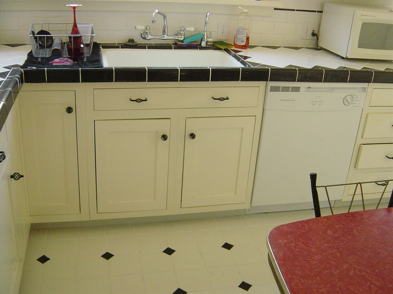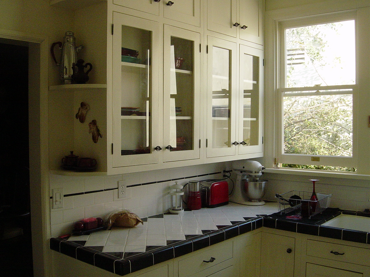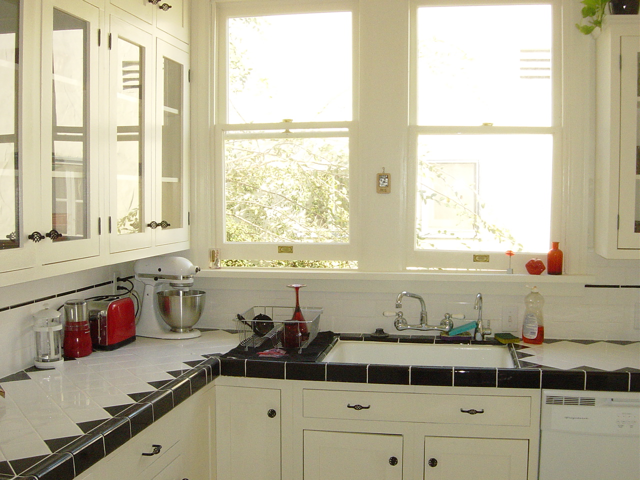 Tim Zeug and I remodeled our own kitchen. (We were living in my mother’s building, so she was very happy). We did 100% all the work ourselves. Below is before and afters and some BTS work in progress. The building was originally from the 1920s but had a horrible remodel job in the 70s. We wanted to restore it to its original style. We used all real materials, cutting the tiles, and Tim custom built all the cupboards. (No Home Depot off the shelf stuff!)
